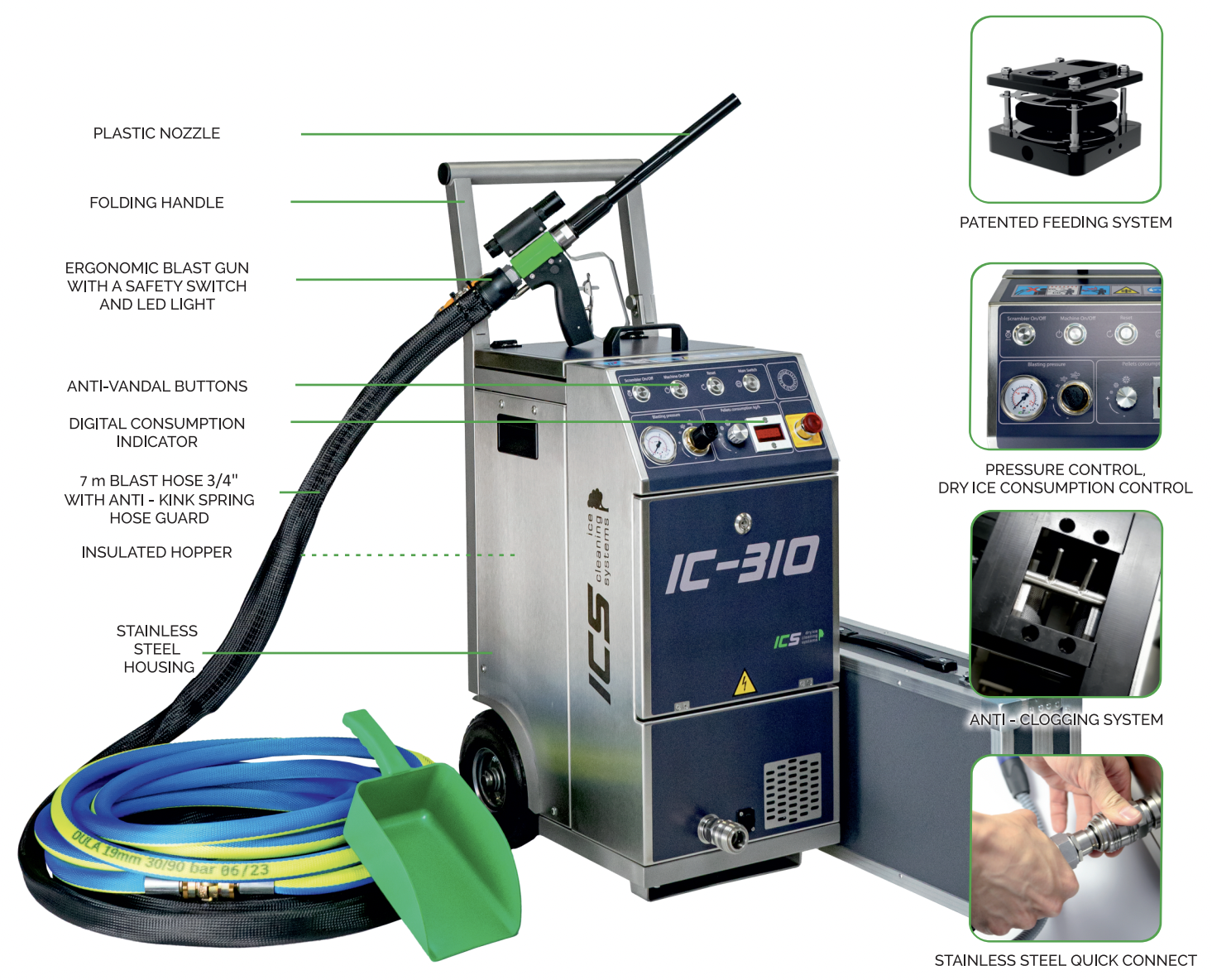 The IC310 professional dry ice blasting machine is intended primarily for the removal of thick and stubborn dirt by using of 3 mm dry ice pellets.The patented feeding system works reliably without any pressure losses, thus allowing you to make the best use of its performance capabilities.